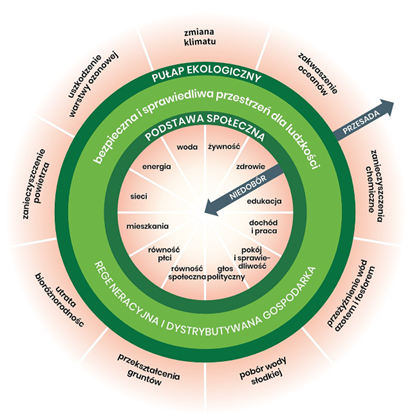 Granice planetarne i dobrobyt ludzkości można zilustrować za pomocą pierścienia, tworząc potężne ramy dla zrozumienia związku między zdrowiem środowiska a potrzebami człowieka. Model ten oddaje pełną złożoność dzisiejszych wyzwań, podkreślając wiele powiązanych ze sobą wymiarów, z którymi musimy się zmierzyć. Określa on dwie krytyczne granice: fundament społeczny, który należy zabezpieczyć, aby zapewnić godną jakość życia WSZYSTKIM, oraz ekologiczny pułap, którego nie wolno przekraczać, jeśli chcemy zachować stabilność naszej planety. Ambicją jest, aby działalność gospodarcza człowieka funkcjonowała w tej bezpiecznej i sprawiedliwej przestrzeni. Oznacza to zaspokojenie podstawowych potrzeb społecznych, takich jak edukacja, zdrowie i dostęp do żywności, przy jednoczesnym pozostawaniu w granicach ekologicznych Ziemi. Należy jednak pamiętać, że ramy te są modelem teoretycznym, a nie gotowym rozwiązaniem. | Rodzi to kluczowe pytanie: czy między fundamentem społecznym a pułapem ekologicznym rzeczywiście istnieje realna przestrzeń, a jeśli tak, to jakie konkretne działania i ścieżki mogłyby nam pozwolić na jej zrównoważone wykorzystanie?